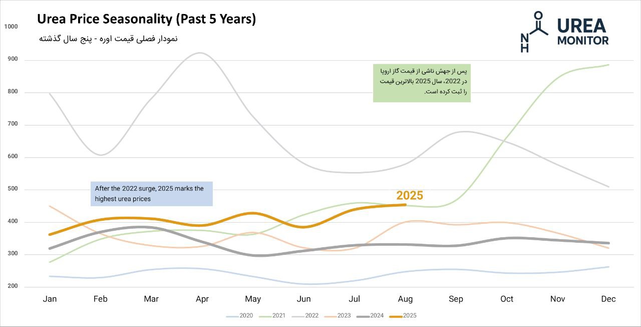 بنابراین میتوان گفت هرچند قله تاریخی سال ۲۰۲۲ همچنان بیرقیب باقی مانده، اما سال ۲۰۲۵ از منظر ثبات روند صعودی و ثبت بالاترین سطوح فصلی در پنج سال اخیر، نقطه عطف تازهای در بازار اوره محسوب میشود.